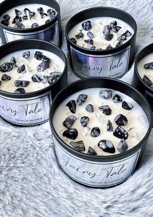 C’est une bougie avec un parfum Doux Rêves, et des cristaux d’Obsidienne neige.
